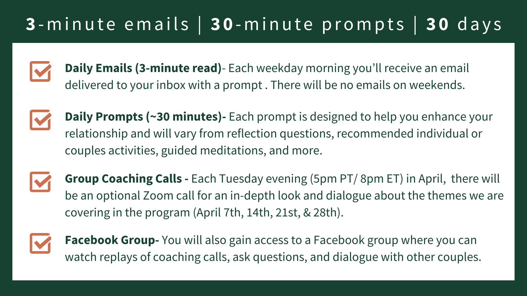 I understand that not everyone necessarily has a newfound abundance of time on your hands. Perhaps for some of you, you might even be more booked. With emails delivered right to your inbox, simple prompts that you can easily integrate into your day, and optional group coaching calls, I want to help set you up for success in enhancing your relationship.